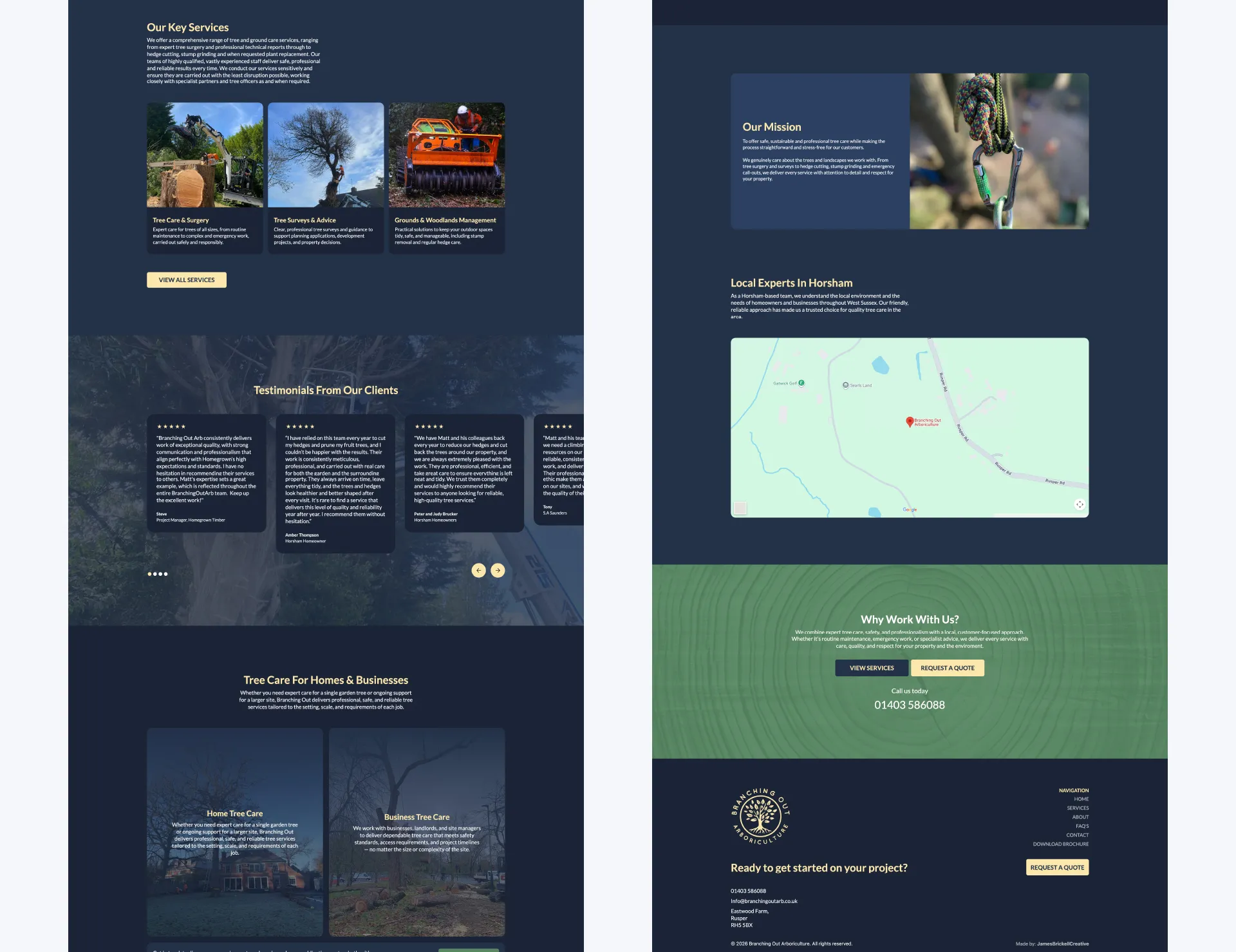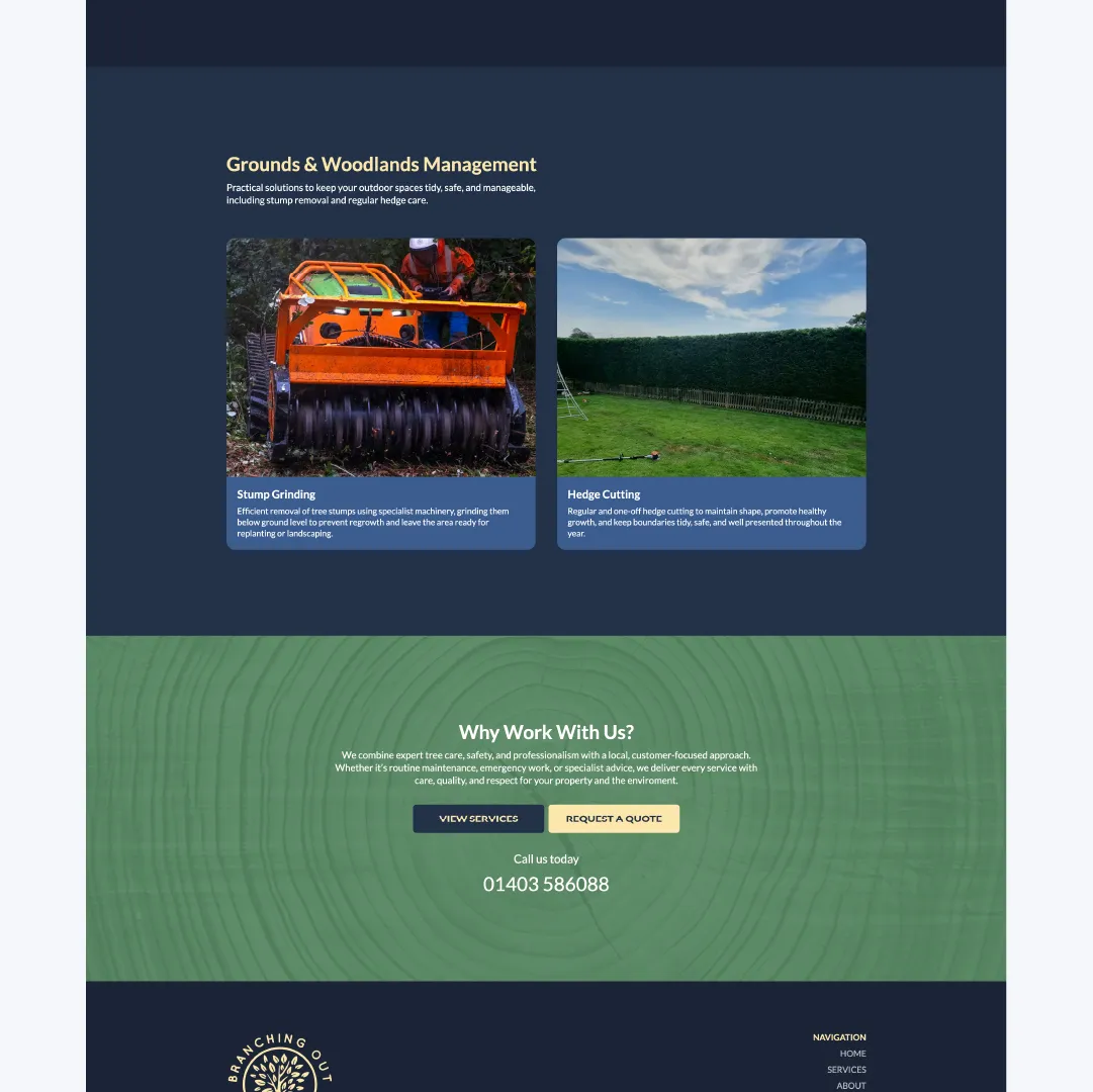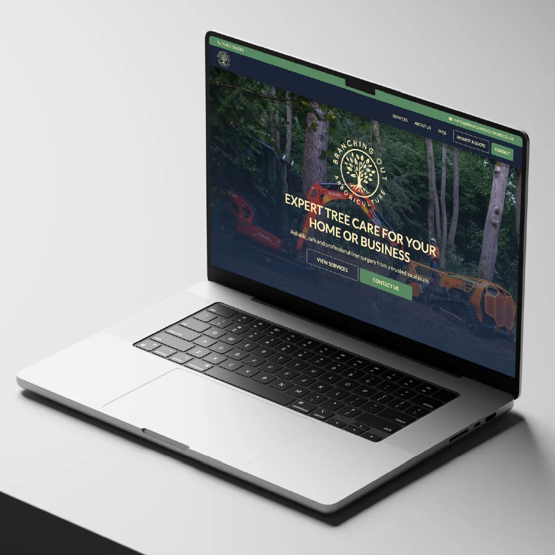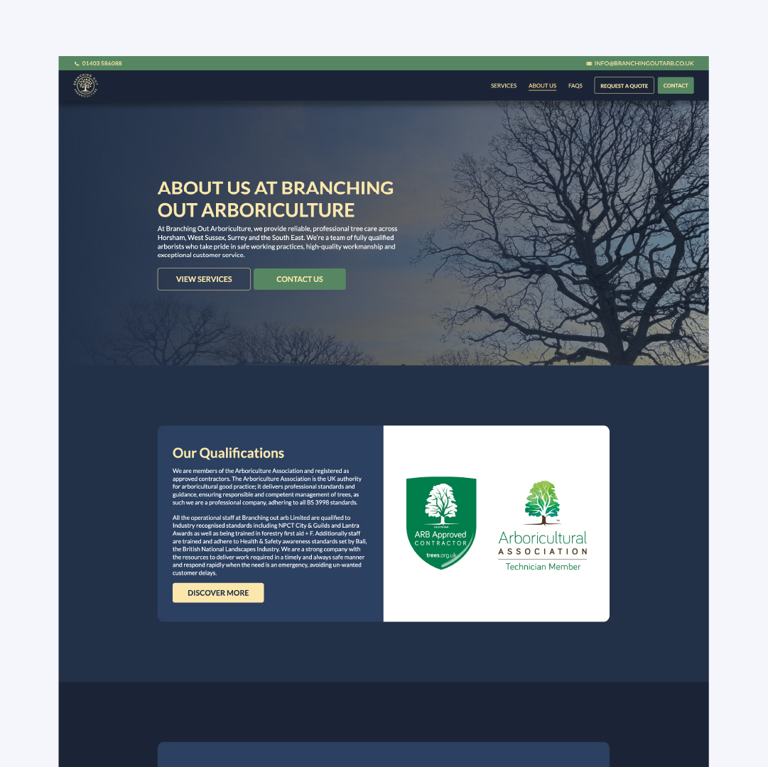 Branching Out Arboriculture is an established tree surgery business based in West Sussex. The brief was to design and build a focused five-page website that clearly communicates the company’s services, safety standards, and professional credentials, while supporting ongoing marketing activity and enquiries.